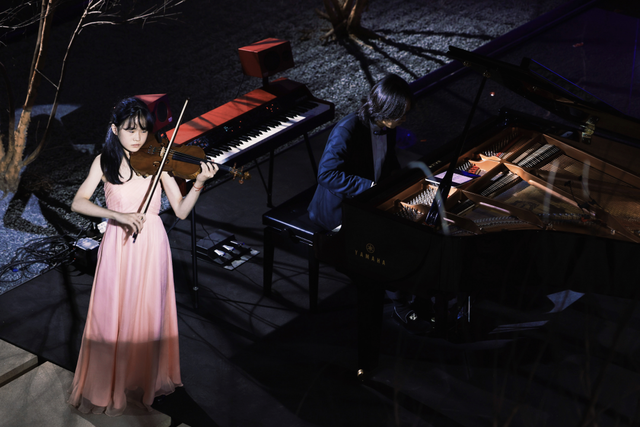 《明月山石》结合巨幕投影,“江流天地外,山色有无中”的意境呼之欲出。《独处》请来大提琴家吴敏喆搭档,钢琴与大提琴之间的私语呢喃,是高山流水遇知音。《彩虹花》结合童声与朗诵,讲述了一个温暖的童话故事。小提琴家黄蒙拉曾多次演绎中国名曲《梁祝》,如今女儿黄羽馨羽翼已丰,也来到现场,用一把小提琴与宋思衡合奏此曲。